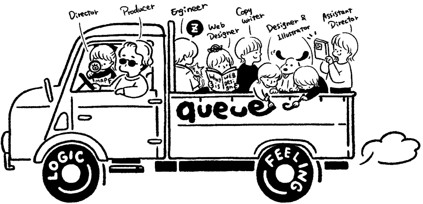 お客さまの魅力を最大限に表現する。メンバー全員がプロフェッショナルであることは当然のことですが、Web制作会社では非常に珍しく、queueにはコピーライターとイラストレーターも在籍しています。