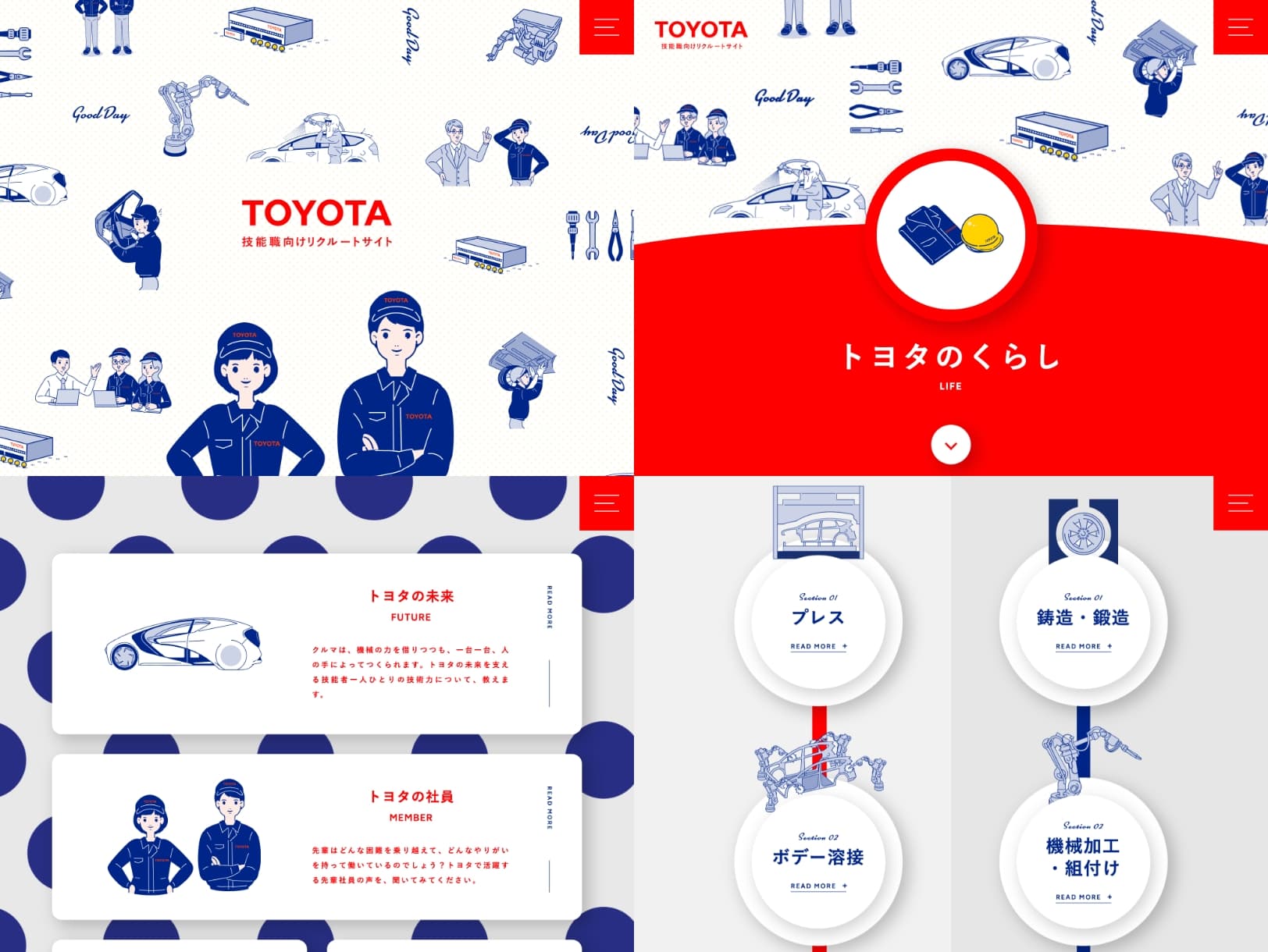 ポップで鮮やかな配色とイラストを配置したデザインにすることで、就職に対する高校生たちのハードルを下げ親しみやすくしました。そのうえで「トヨタのものづくり」の魅力がPCでもスマホでも直感的に伝わるよう、従来のものから一新して再構成。興味を持って読み進めてもらえるようなサイトになり、長年にわたって活用していただいております。