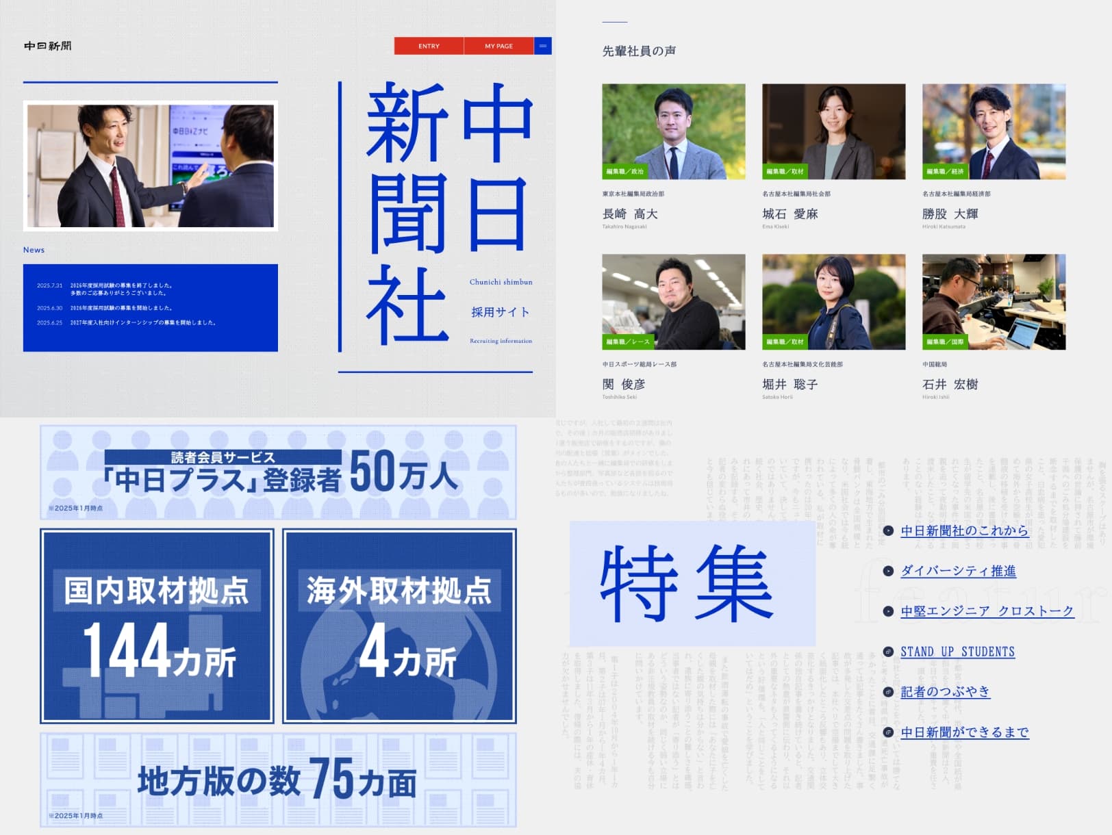 代理店さまと共同で採用サイトを制作、queueは主にデザイン、イラストレーション、コーディングを担当しました。情報の多い中でもわかりやすく、企業の魅力を伝えるにはどうしたらいいかを模索し、まるで新聞を読んでいるかのようなデザインとコンテンツに。