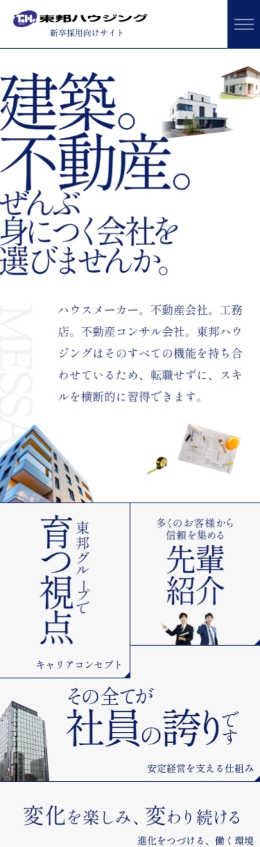 東京都大田区を基盤に不動産事業を展開する、東邦ハウジング株式会社さまの採用サイトを担当いたしました。企画設計とコピーライティングを株式会社ピストルズさまが、デザインとコーディングを弊社が担当させていただきました。