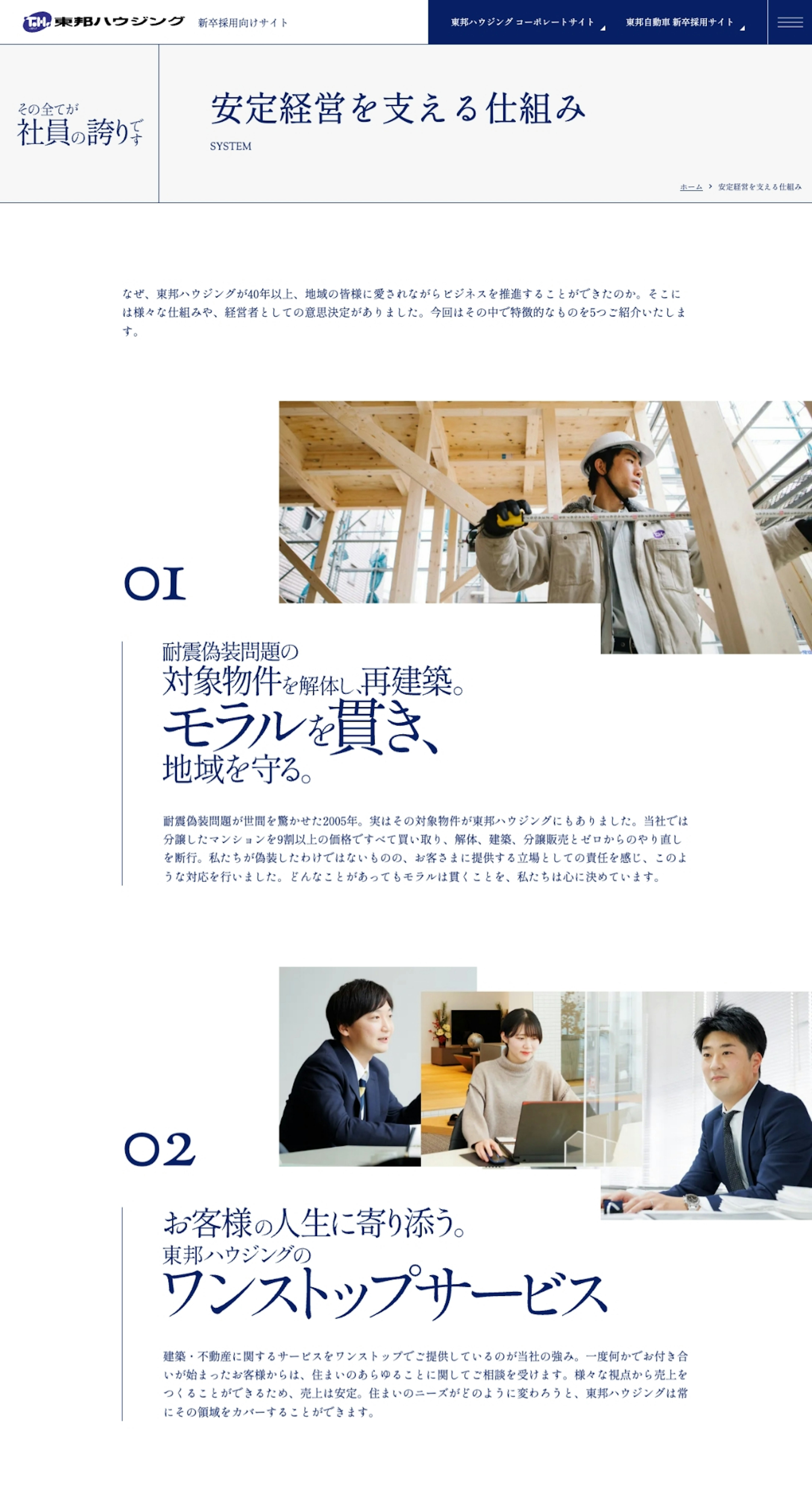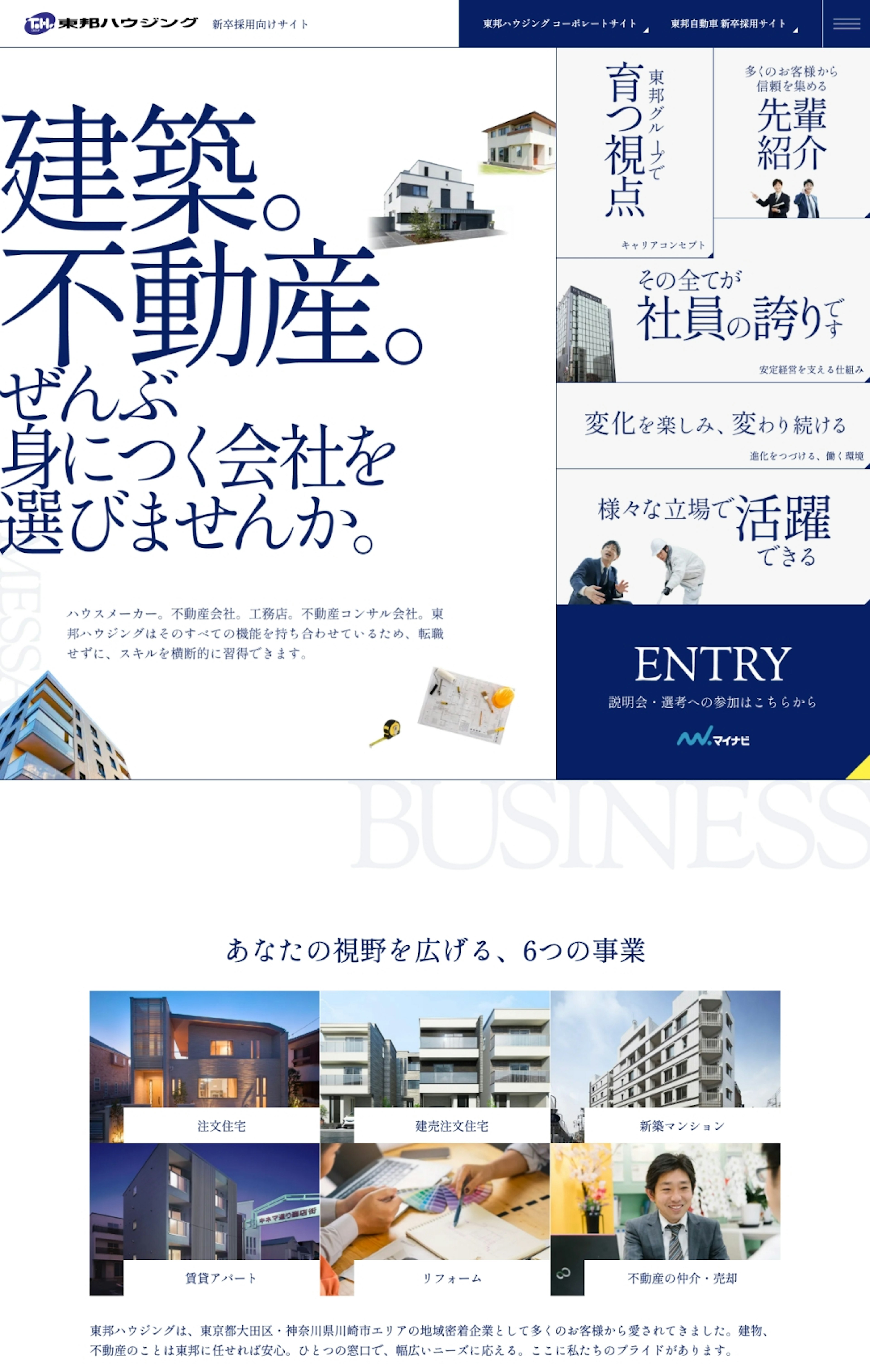 東京都大田区を基盤に不動産事業を展開する、東邦ハウジング株式会社さまの採用サイトを担当いたしました。企画設計とコピーライティングを株式会社ピストルズさまが、デザインとコーディングを弊社が担当させていただきました。