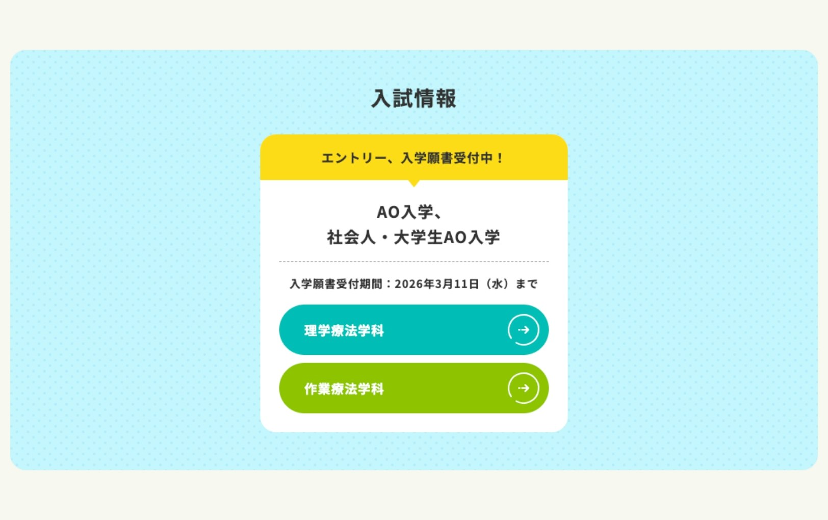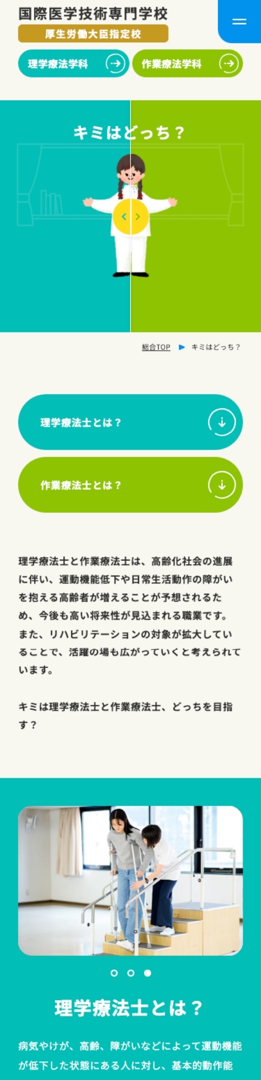 学科を混同させないための設計として、理学療法学科と作業療法学科それぞれに専用の入り口を設けることで両学科の違いを明確にし、ユーザーが自分の志望学科に関する情報に迷わず辿り着けるように工夫しました。