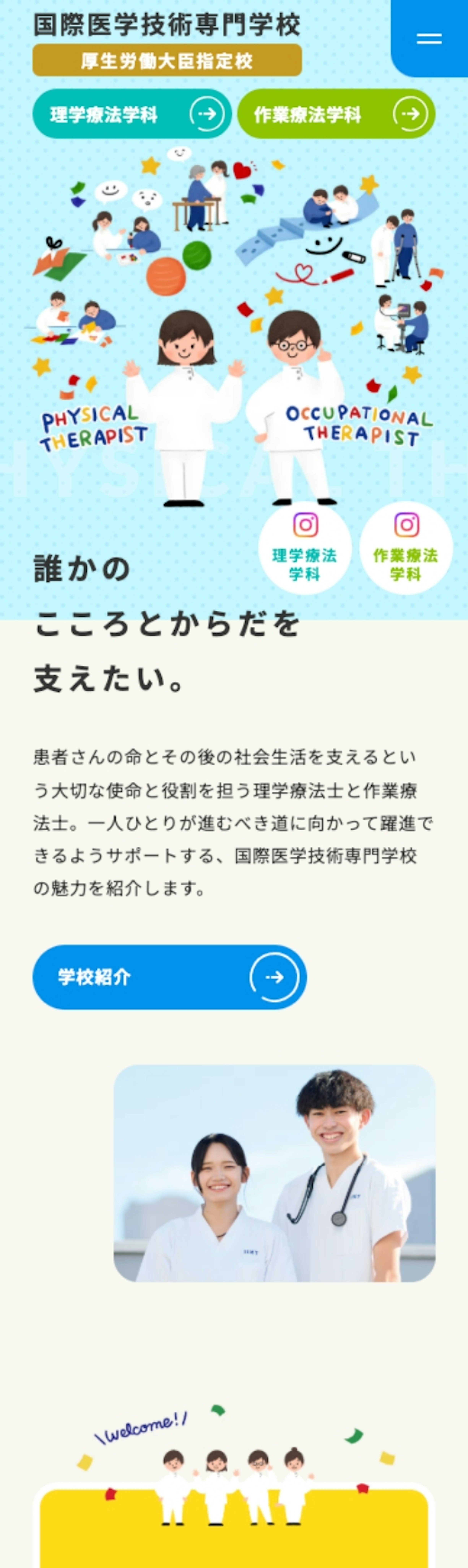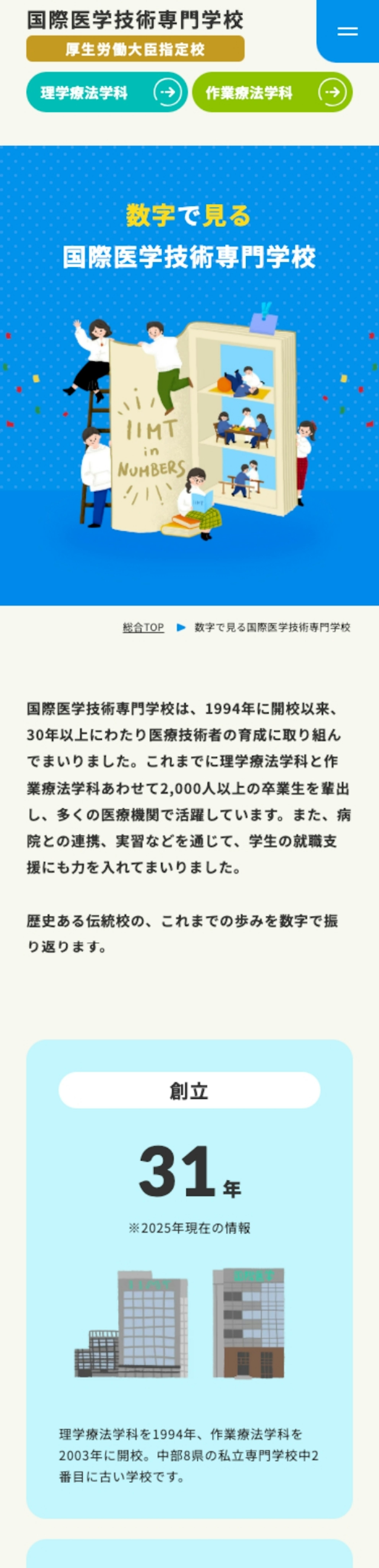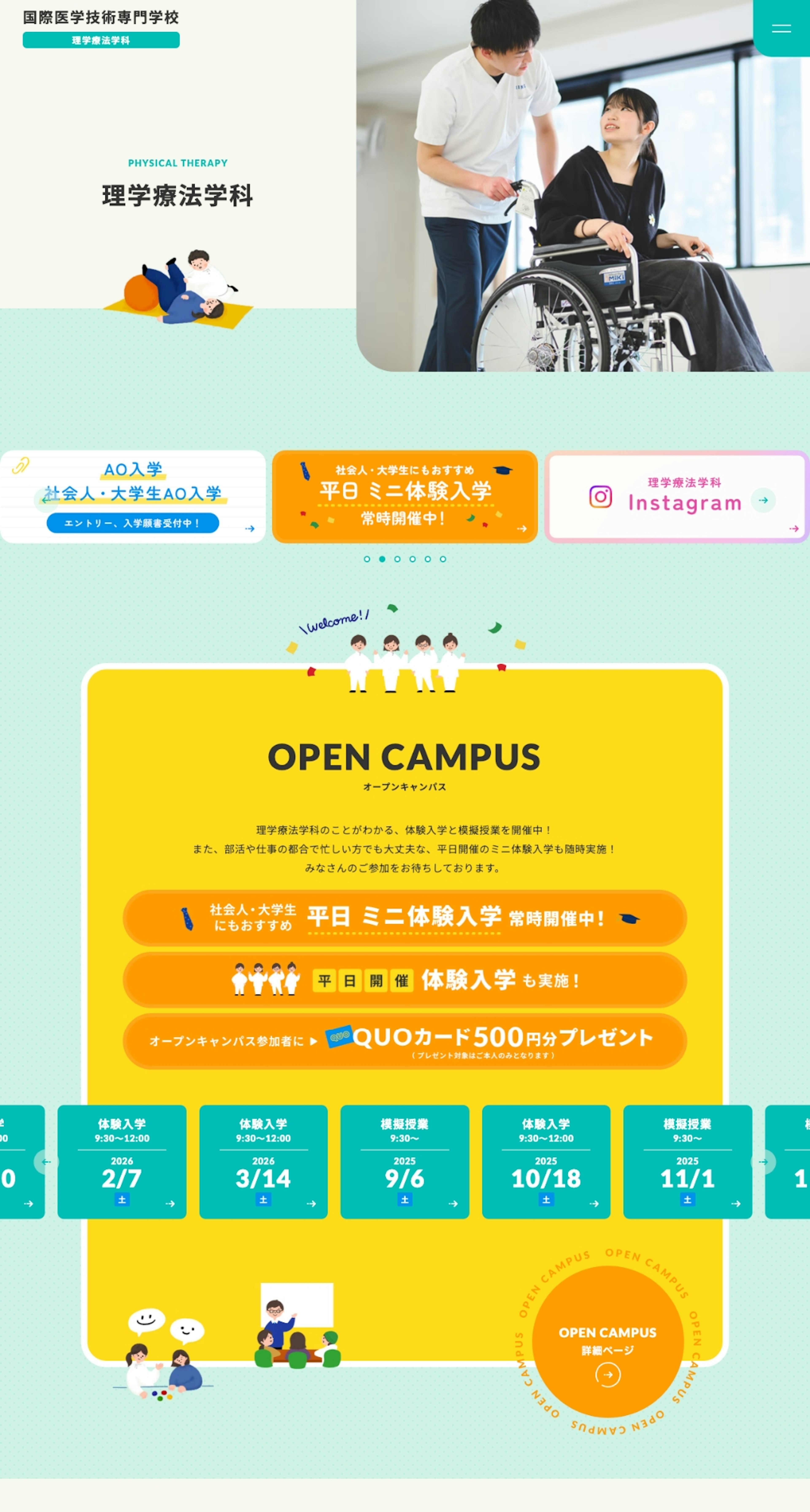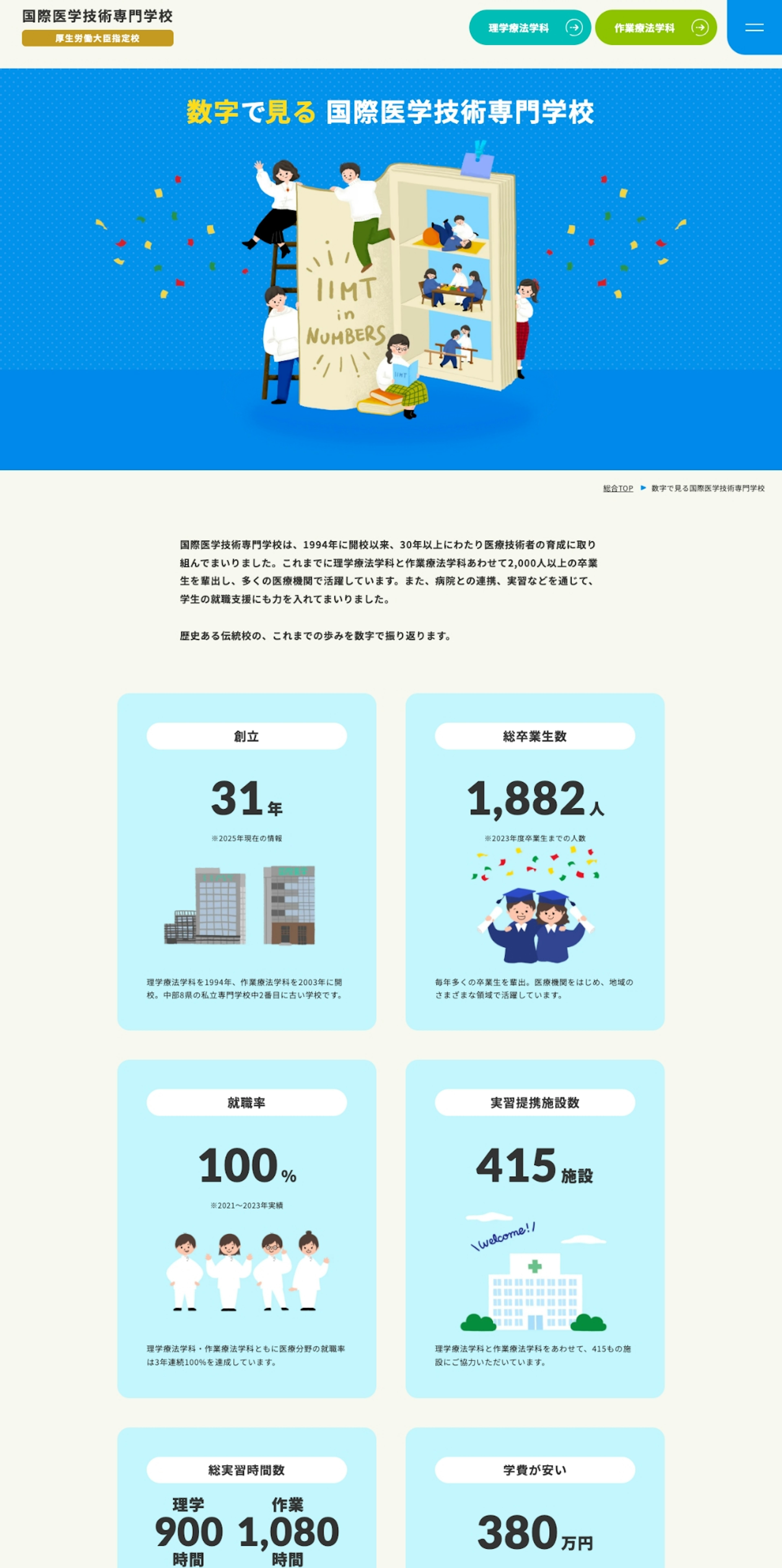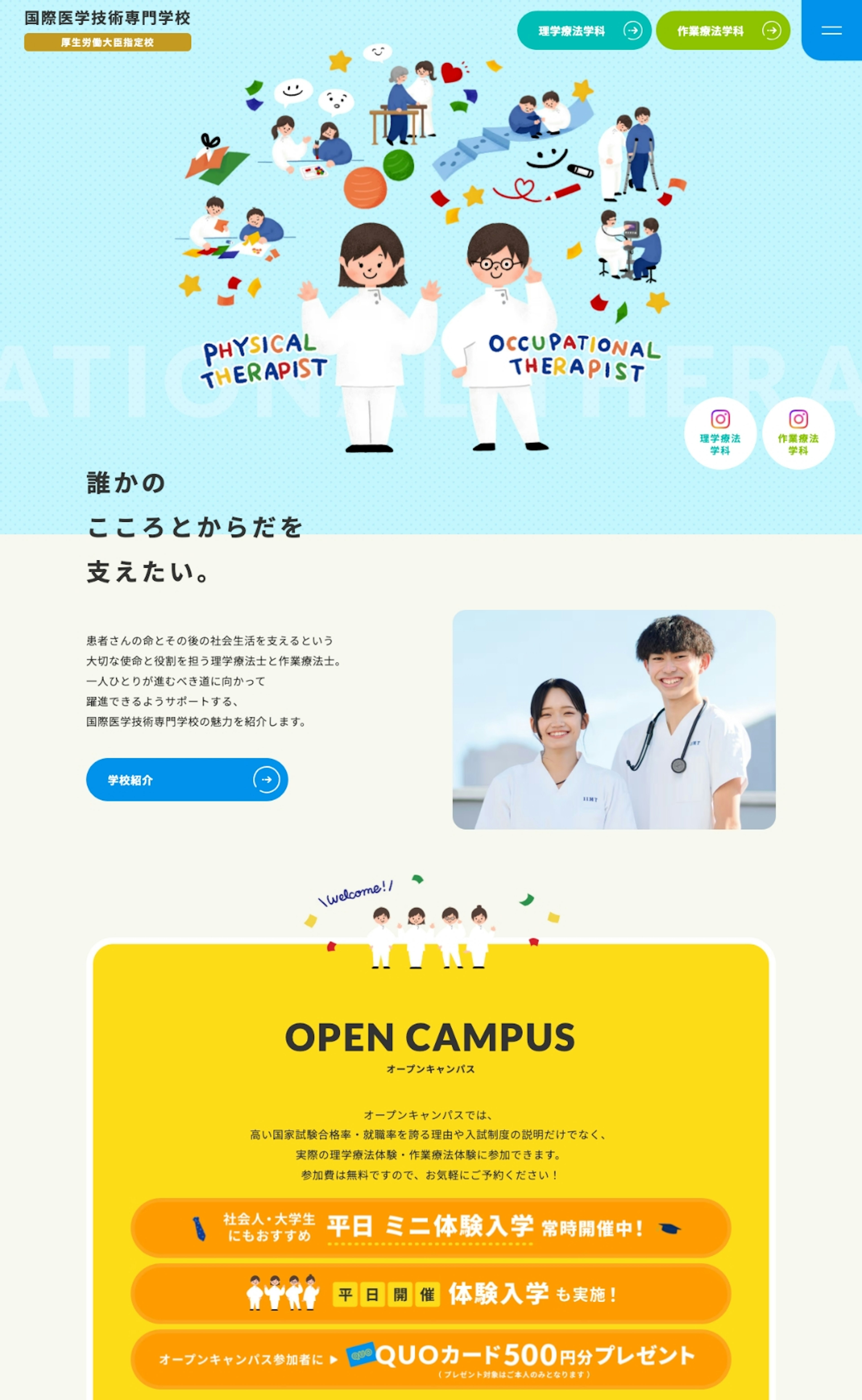 国際医学技術専門学校さまは、理学療法学科と作業療法学科を有する名古屋市の専門学校です。少子化が進むなか、専門学校の強みを明確に伝え、オープンキャンパスへの参加促進や入学者の獲得に繋げたいとのご相談をいただき、創立30周年を迎えるタイミングで学校サイトをリニューアルいたしました。