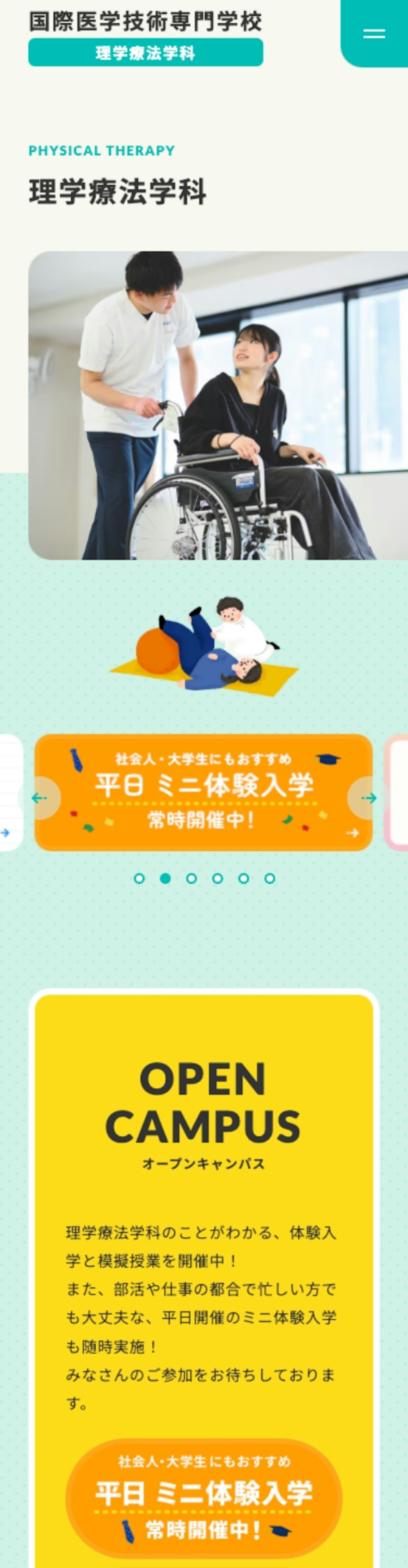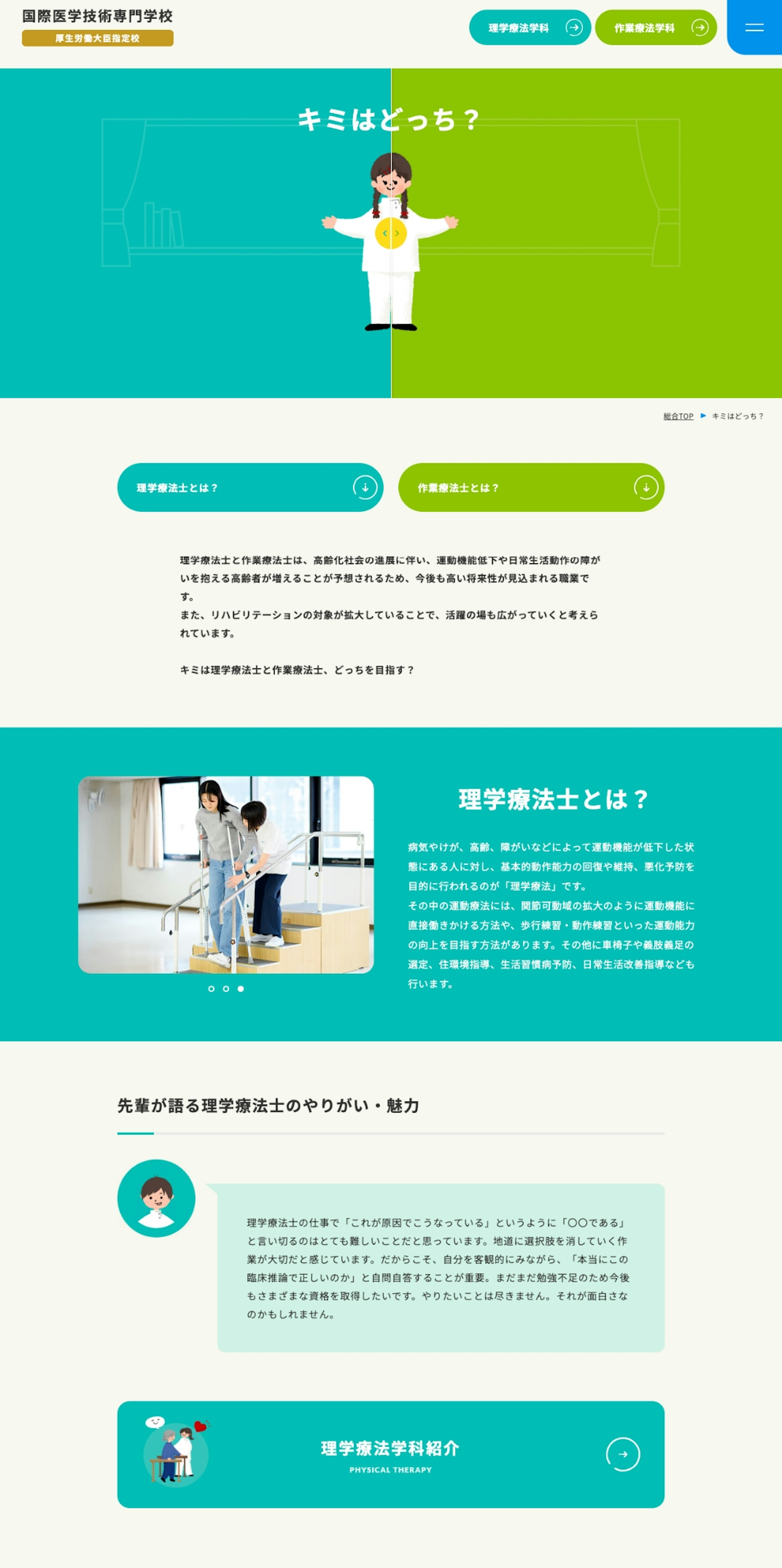 学科を混同させないための設計として、理学療法学科と作業療法学科それぞれに専用の入り口を設けることで両学科の違いを明確にし、ユーザーが自分の志望学科に関する情報に迷わず辿り着けるように工夫しました。