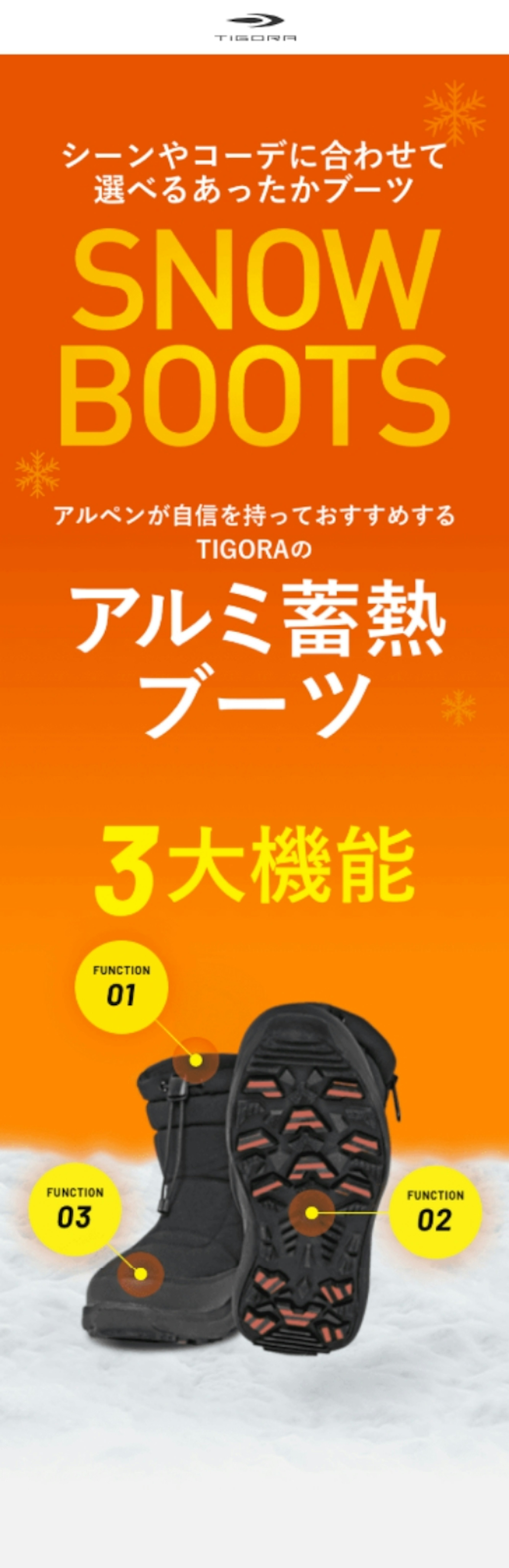 株式会社アルペンさまのプライベートブランド「TIGORA」が展開しているスノーブーツ「アルミ蓄熱」シリーズの販売を訴求するLPを制作いたしました。