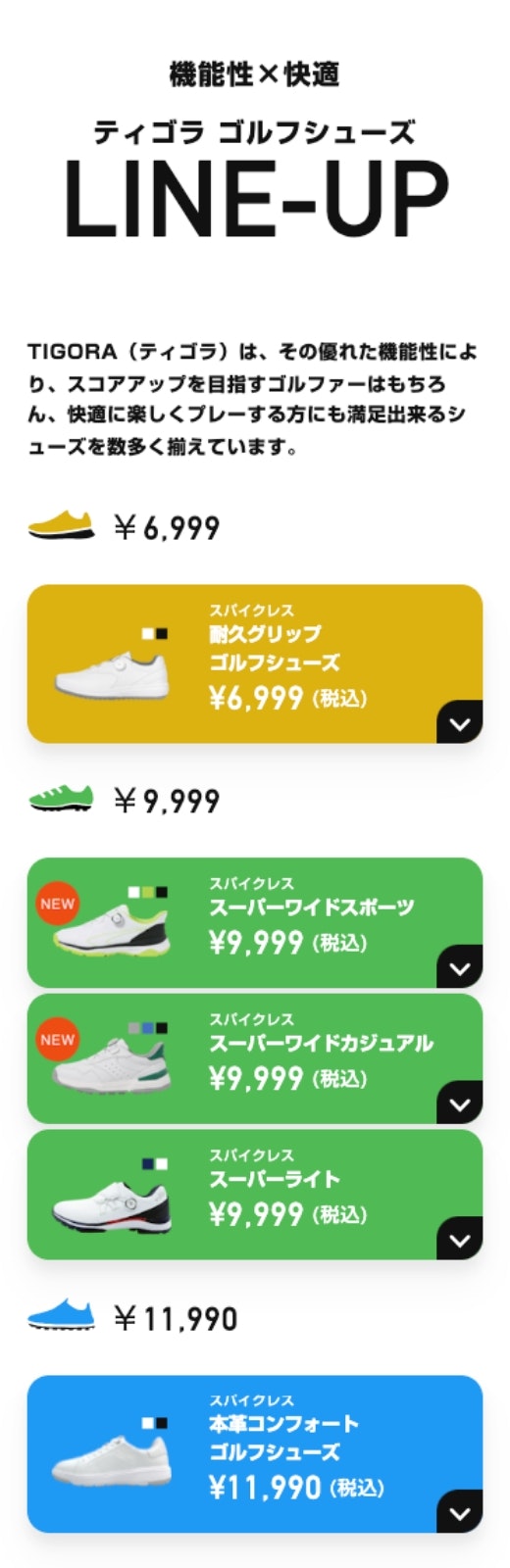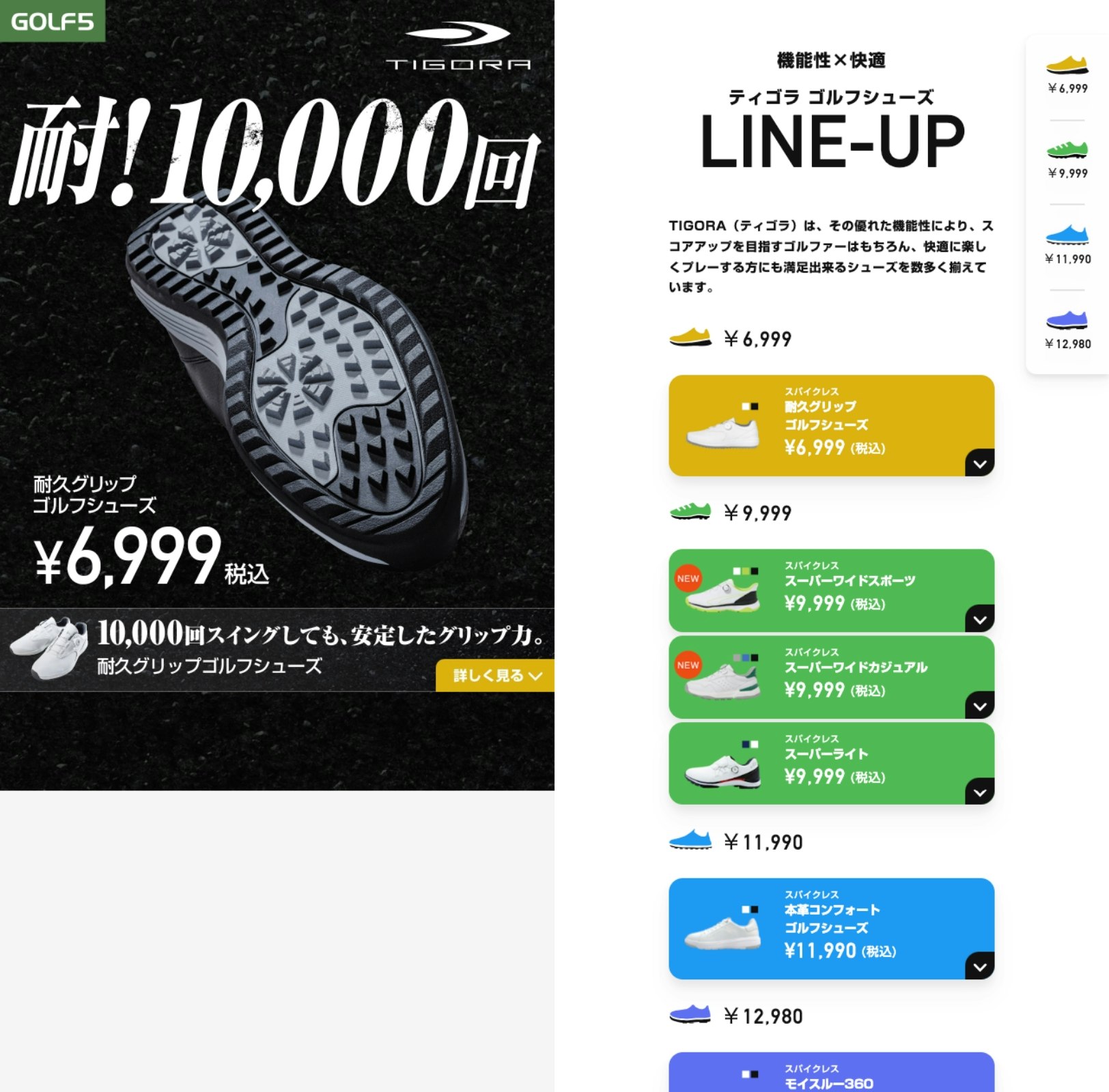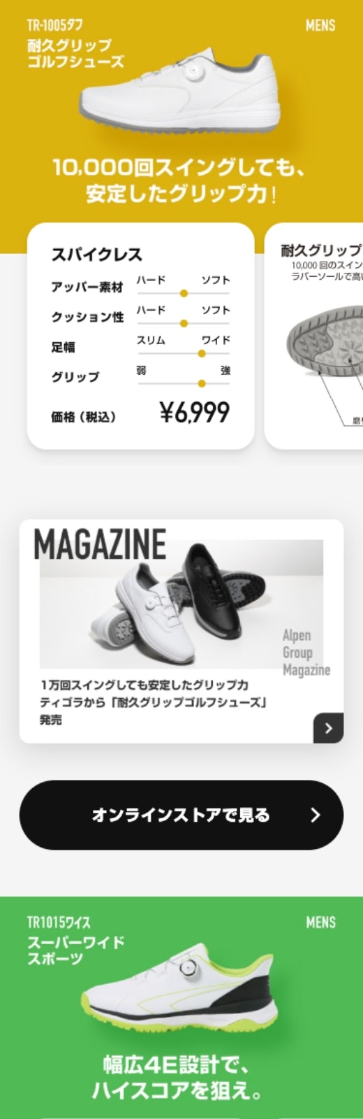 株式会社アルペンさまのプライベートブランド「TIGORA」から販売されている、ゴルフシューズの販売訴求LPを制作いたしました。