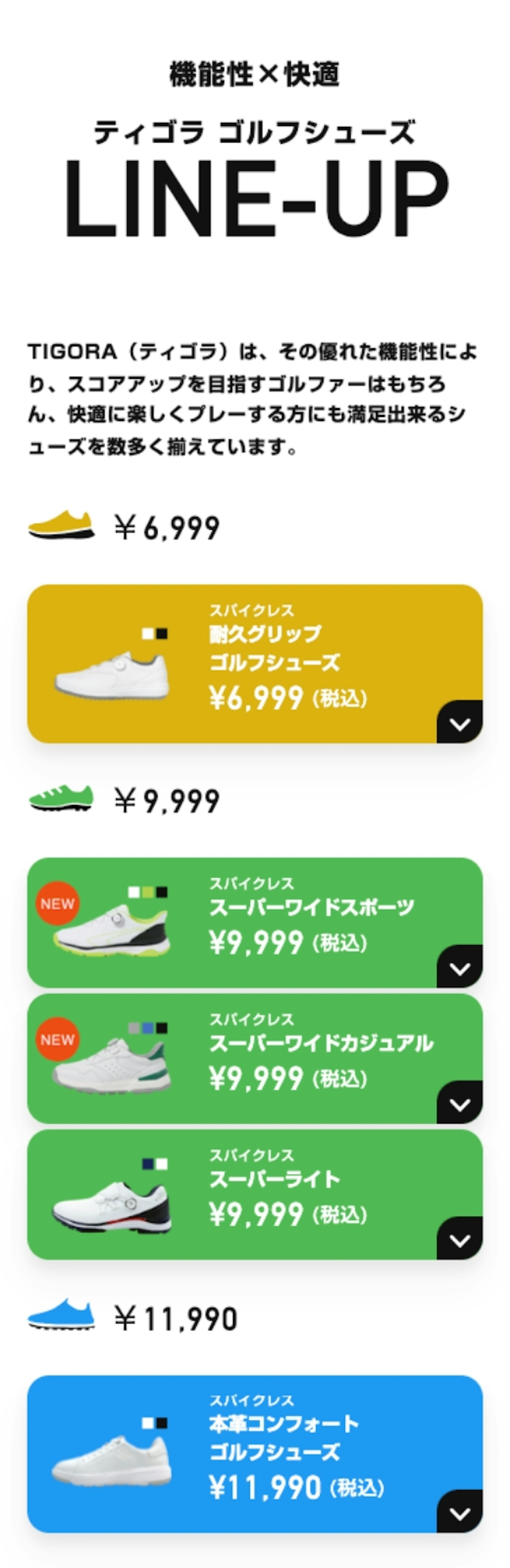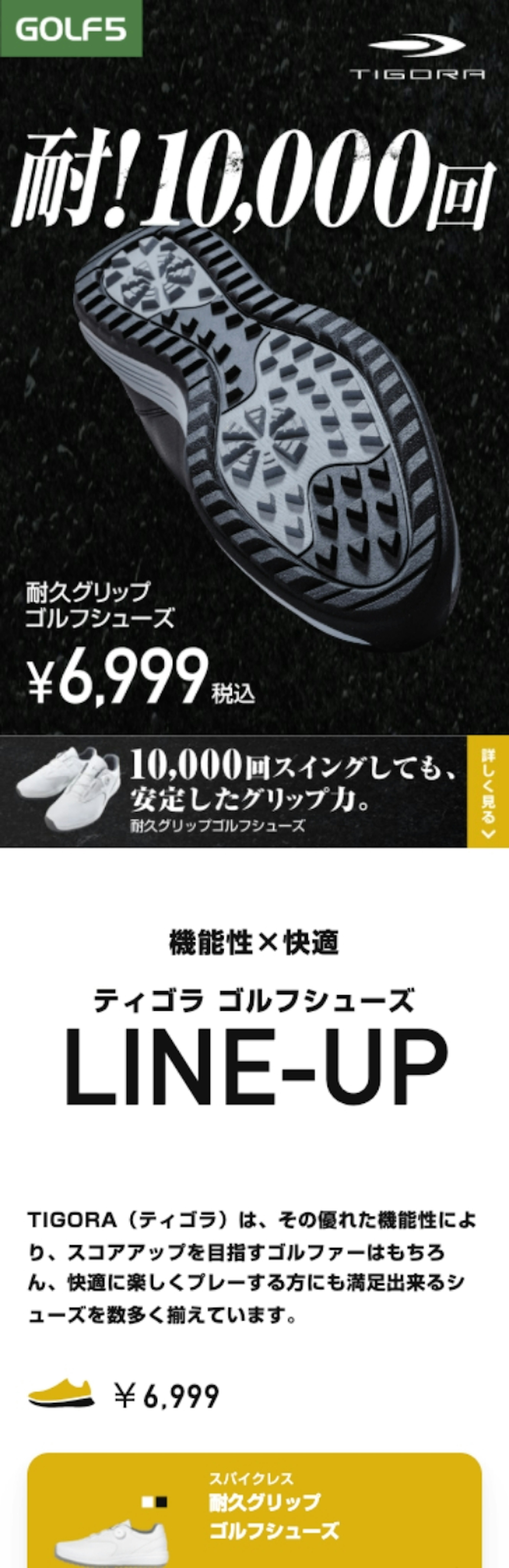 株式会社アルペンさまのプライベートブランド「TIGORA」から販売されている、ゴルフシューズの販売訴求LPを制作いたしました。