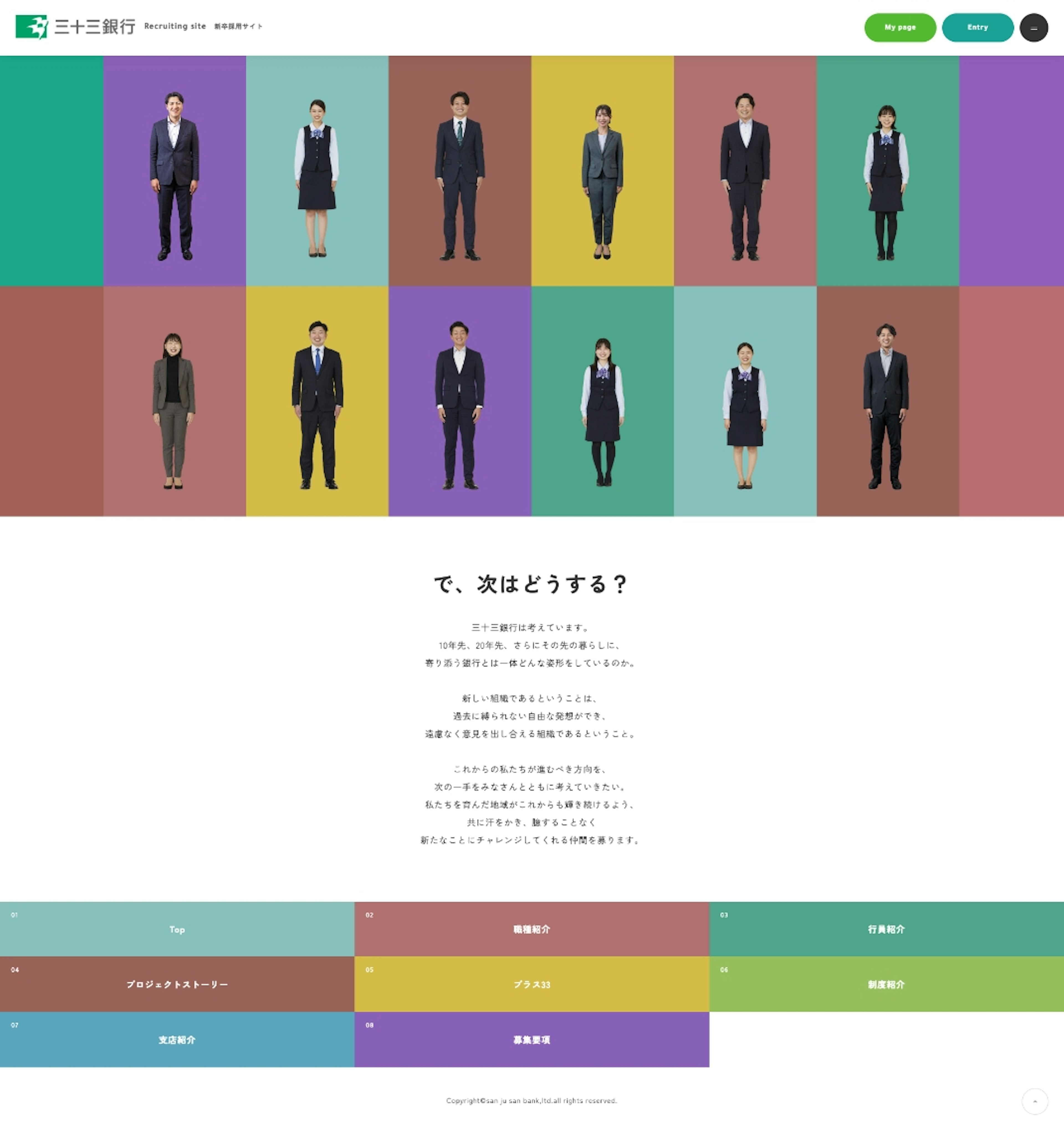 「さまざまな挑戦をしてみたい熱い人」にフォーカスしたいという想いを反映し、「で、次はどうする?」をキャッチコピーに、未来へ一歩を踏み出す学生に響く新卒採用サイトを提案させていただきました。(※原稿は広告代理店さまがご担当)