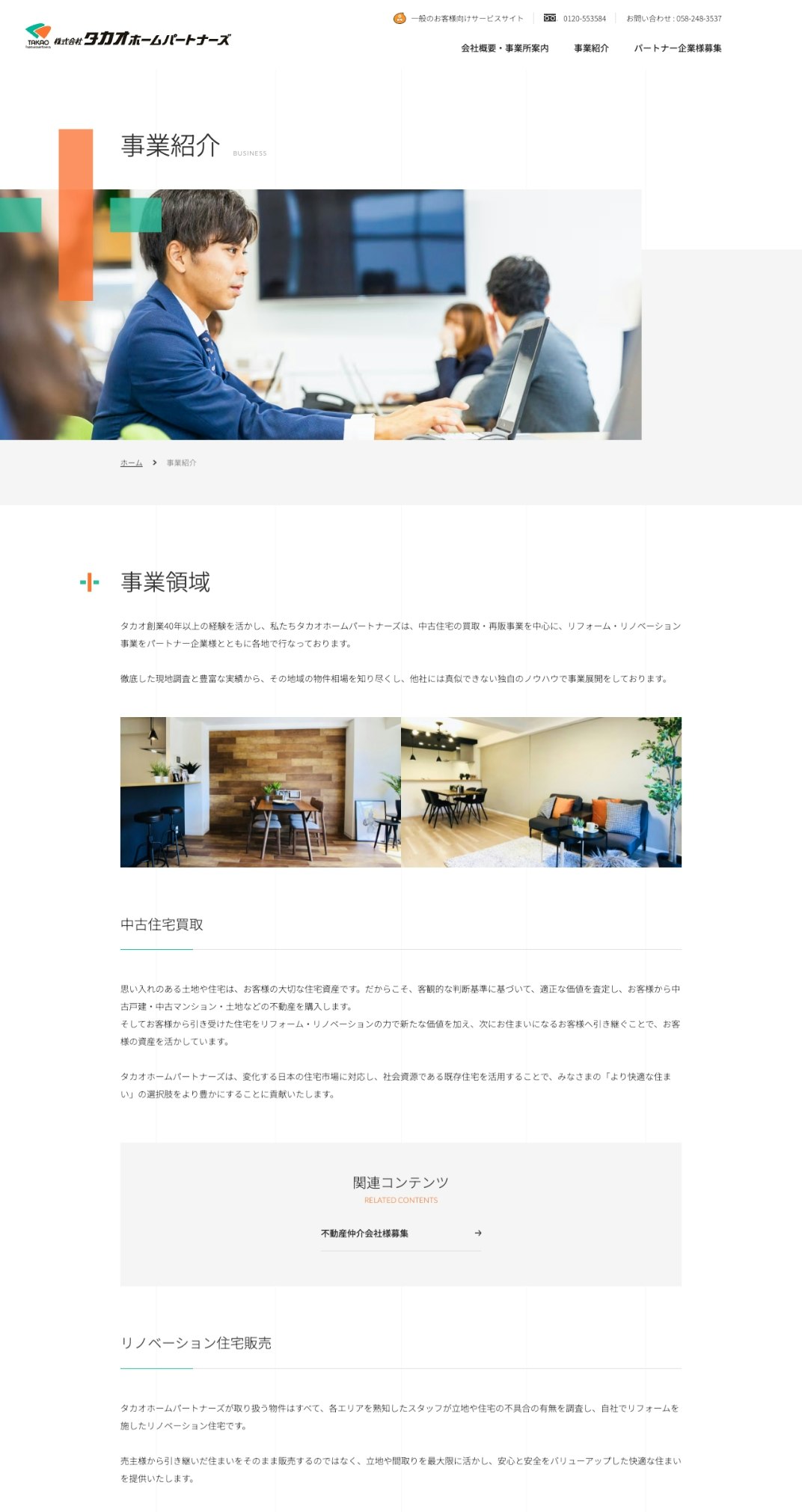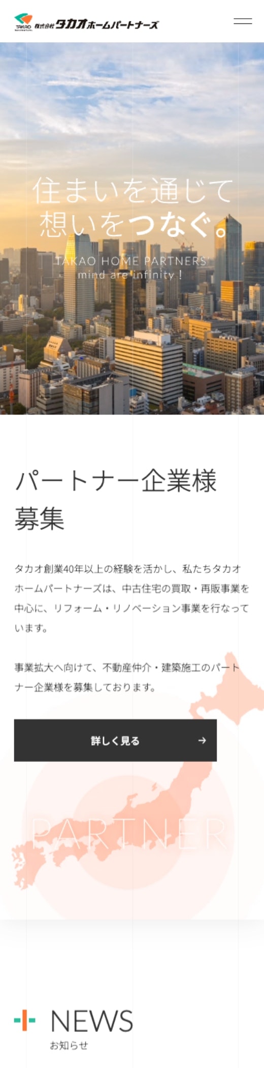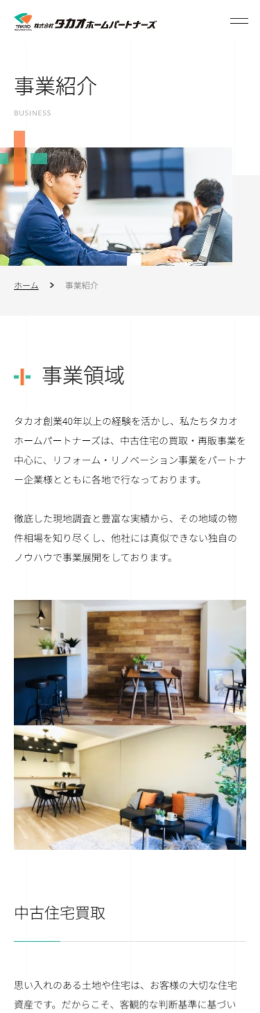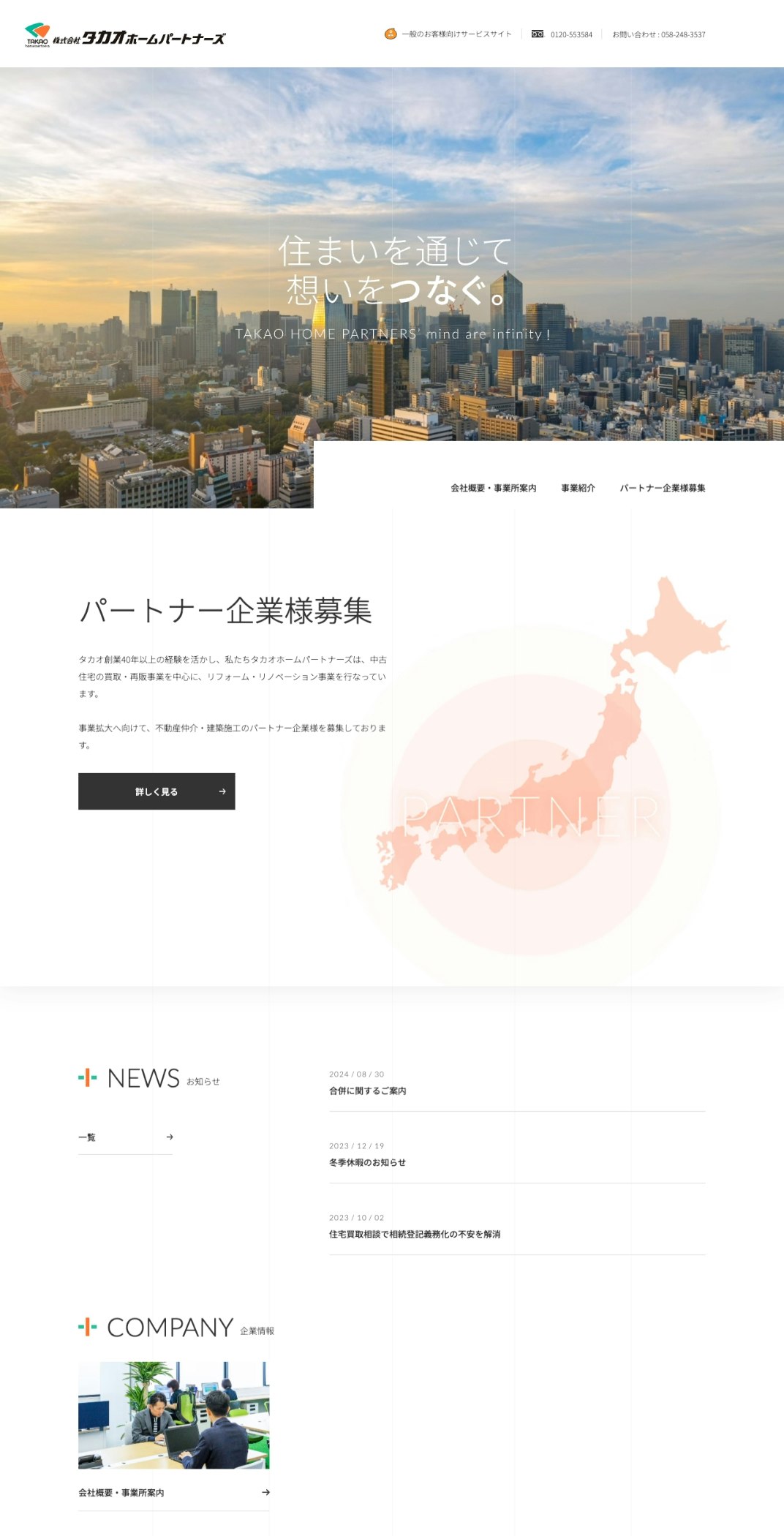 株式会社タカオホームパートナーズさまは、中古住宅の買取・再販事業を中心に、リフォーム・リノベーション事業を行う不動産会社です。旧サイトでは 「事業としての個性が伝わりにくい」「協力会社やパートナーへのメリットが十分に発信できていない」といった課題をご相談いただき、企業サイトのフルリニューアルを提案いたしました。
