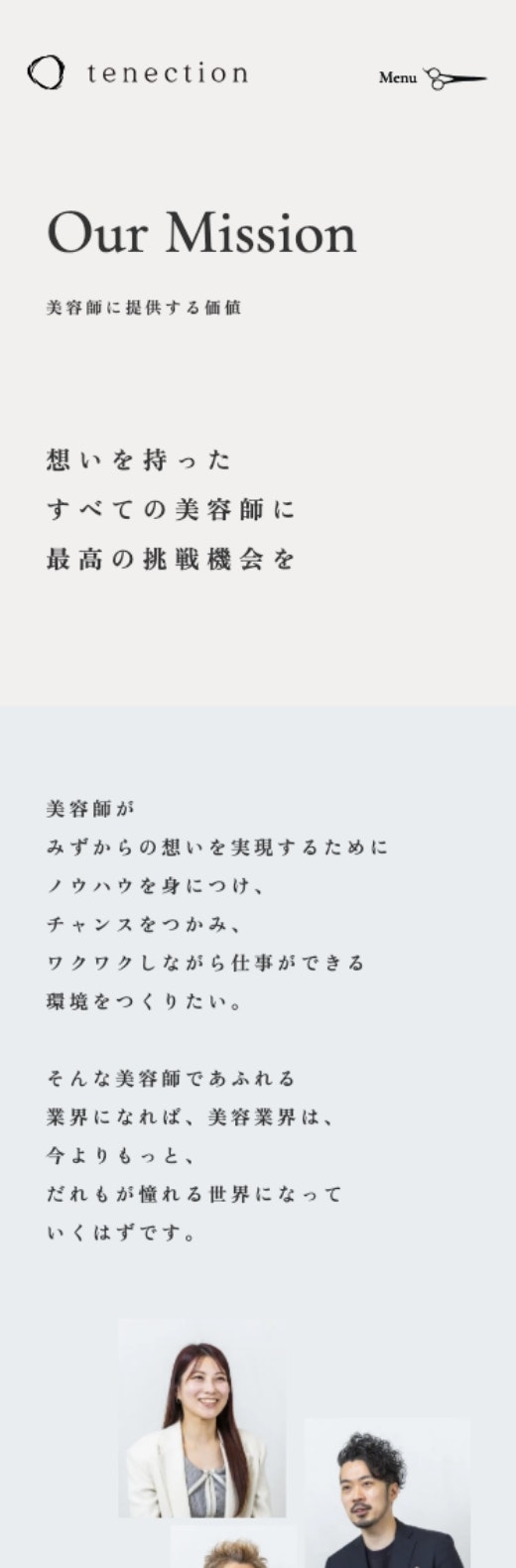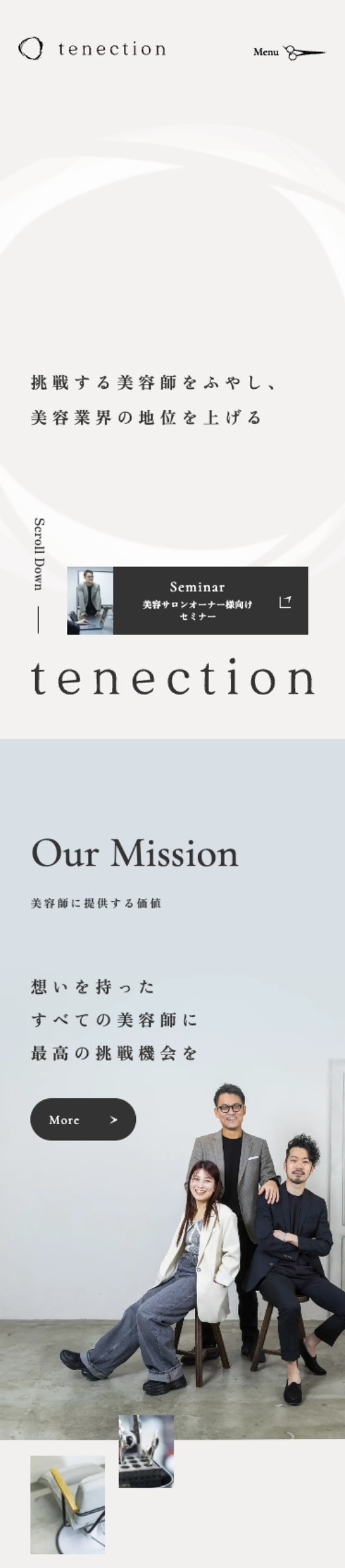 関西エリアを中心に国内外20以上の美容サロンを保有する、株式会社tenectionさまのコーポレートサイトを制作いたしました。企画設計とコピーライティングを株式会社ピストルズさまが、デザインとコーディングを弊社が担当させていただきました。