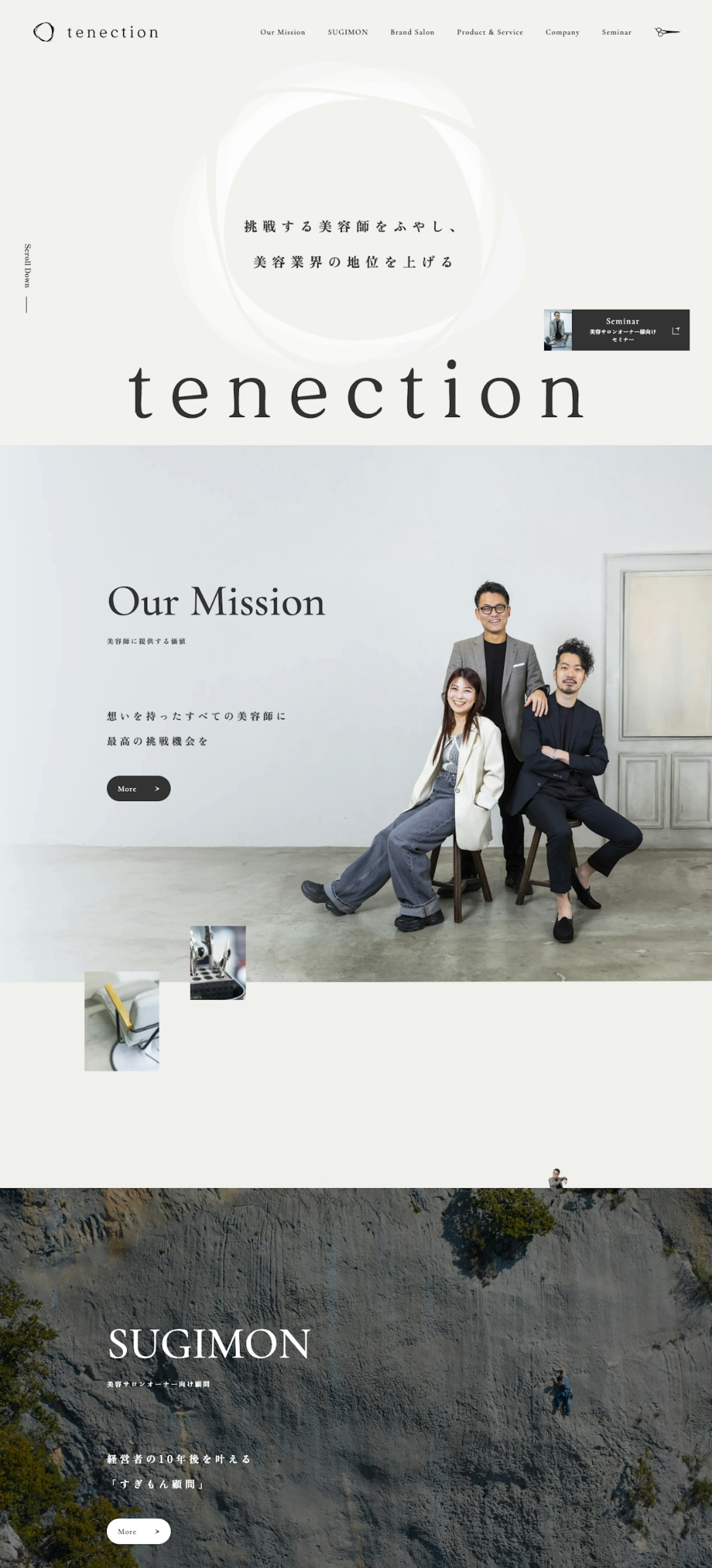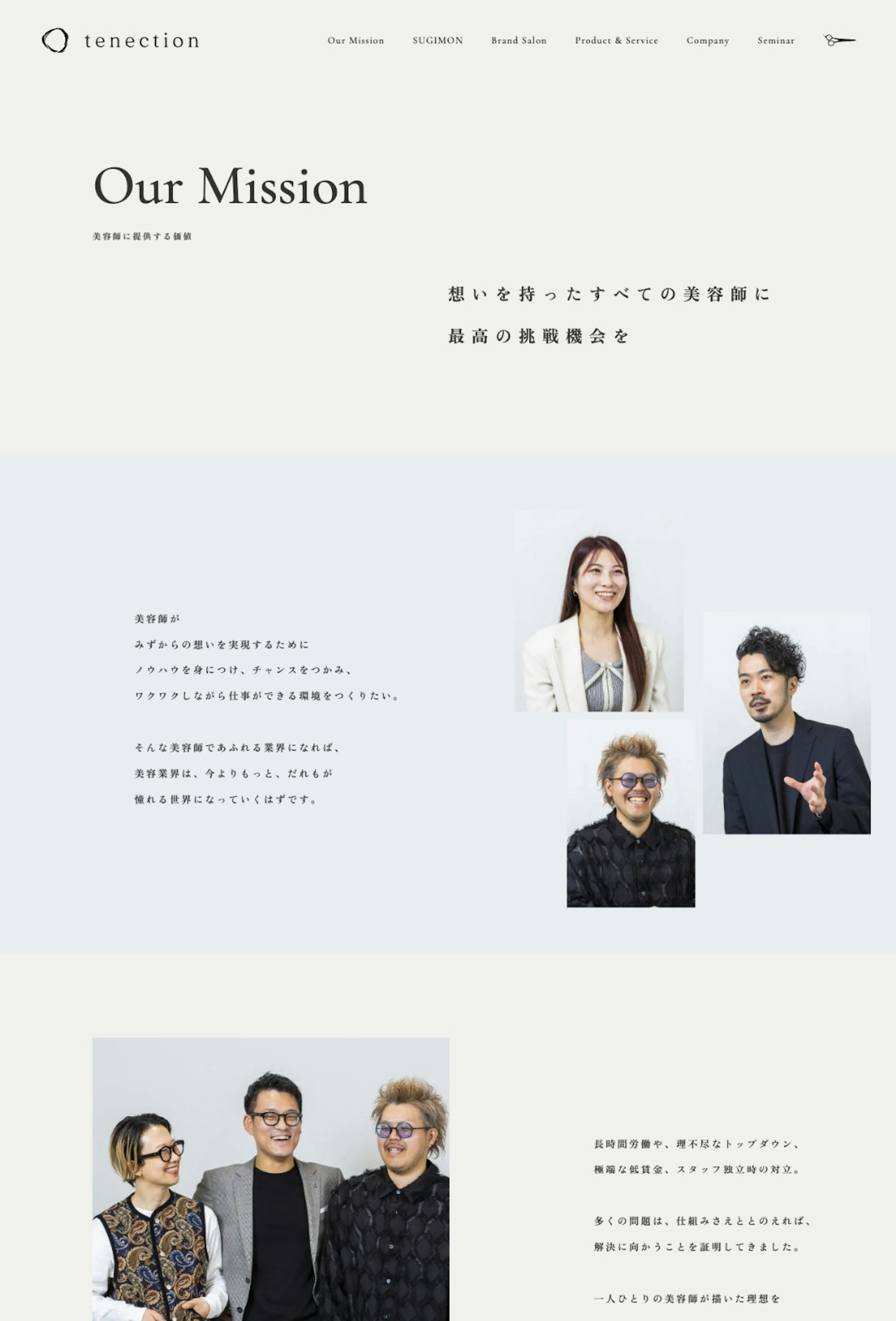 関西エリアを中心に国内外20以上の美容サロンを保有する、株式会社tenectionさまのコーポレートサイトを制作いたしました。企画設計とコピーライティングを株式会社ピストルズさまが、デザインとコーディングを弊社が担当させていただきました。