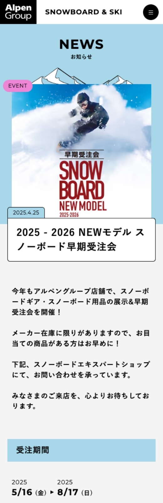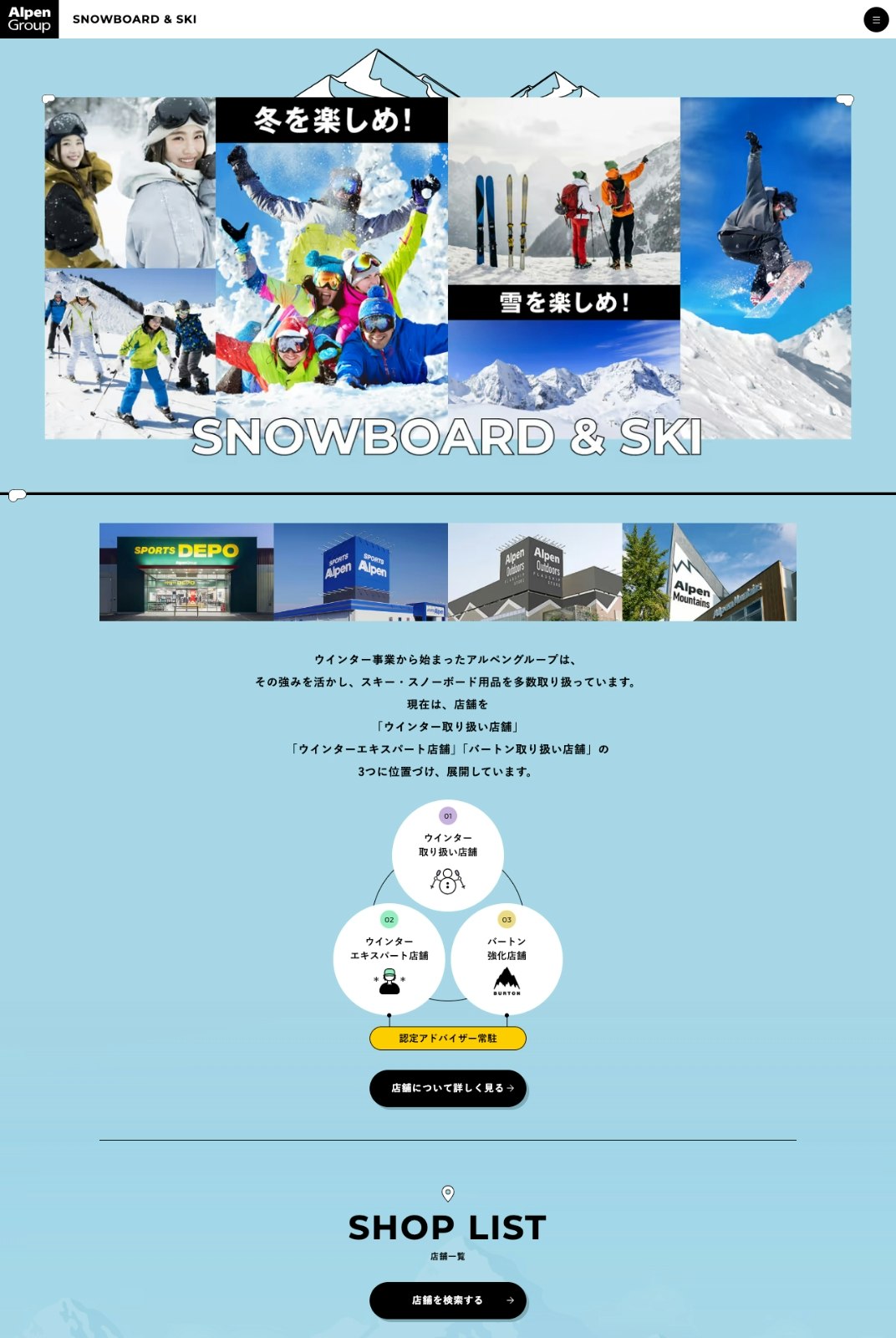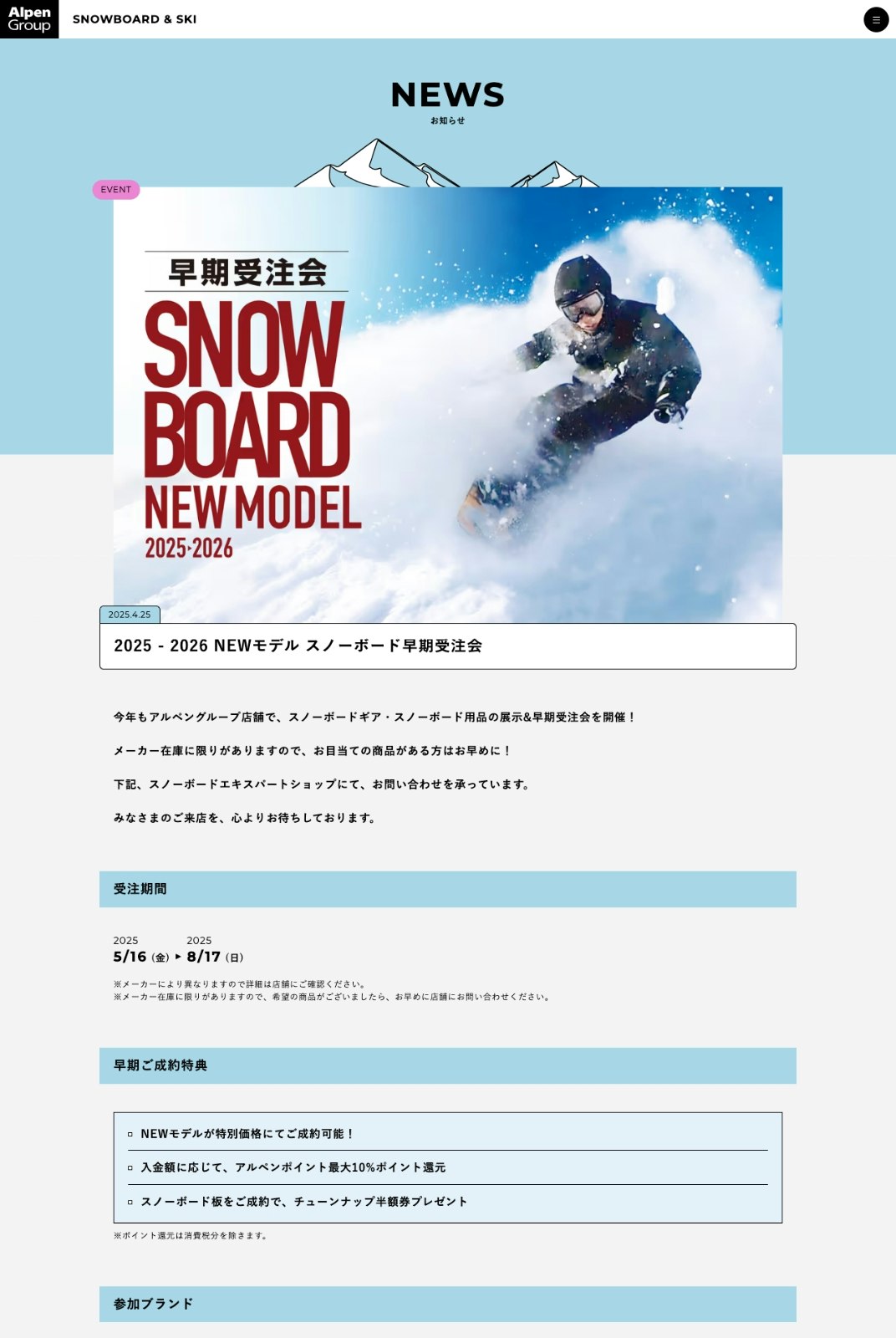 ウインター用品の取り扱い店舗や新作受注会のお知らせなど、ウインタースポーツに関する情報を集約するツールがほしいとのご要望を受けて、メディア型のWebサイトを制作いたしました。
