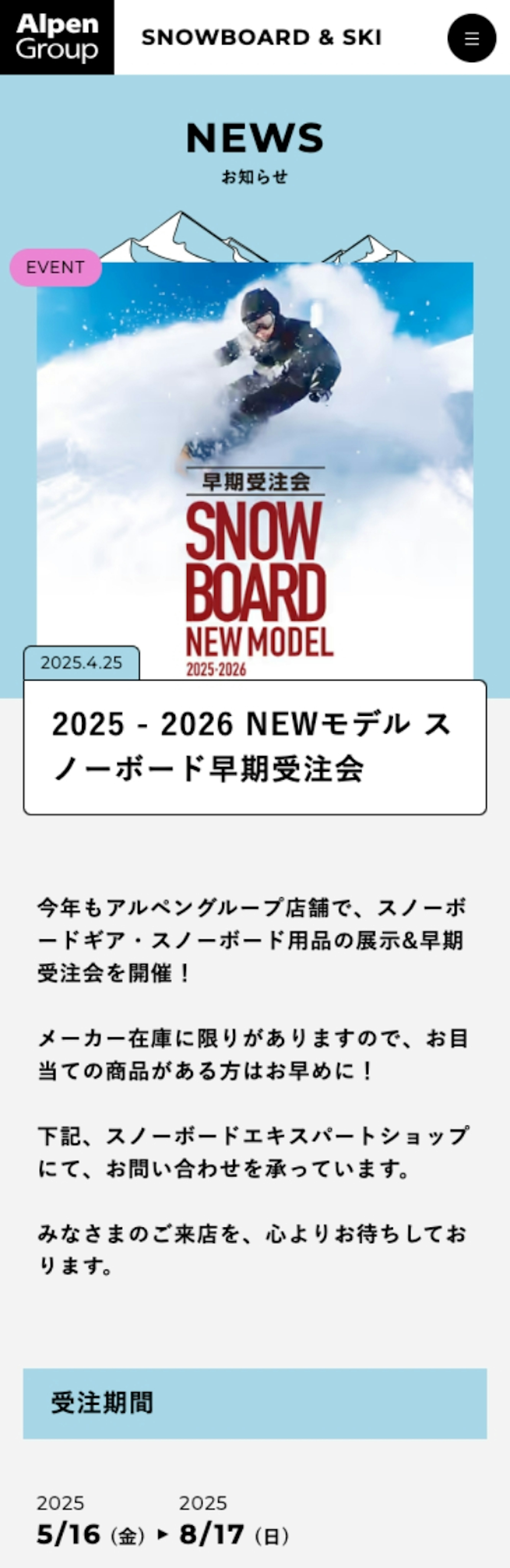 ウインター用品の取り扱い店舗や新作受注会のお知らせなど、ウインタースポーツに関する情報を集約するツールがほしいとのご要望を受けて、メディア型のWebサイトを制作いたしました。