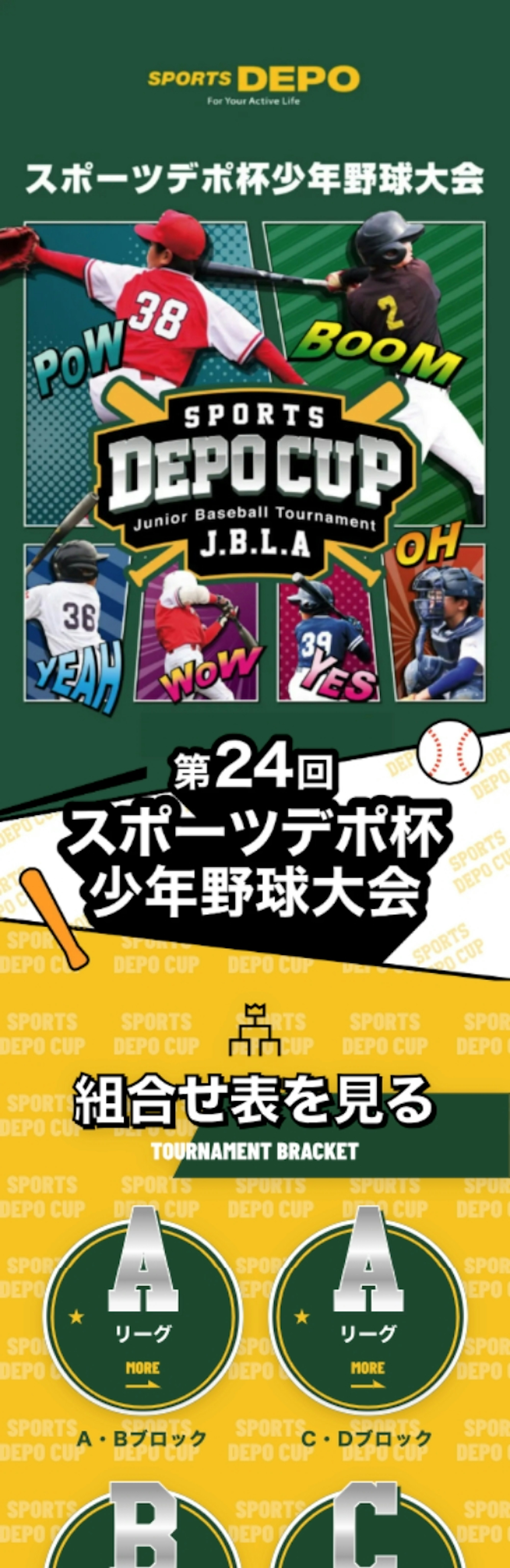 株式会社アルペンさまが後援する、ジュニアベースボールリーグ愛知主催の少年野球大会「スポーツデポ杯」の大会スケジュールや成績一覧など、大会情報を集約した公式ページを制作いたしました。