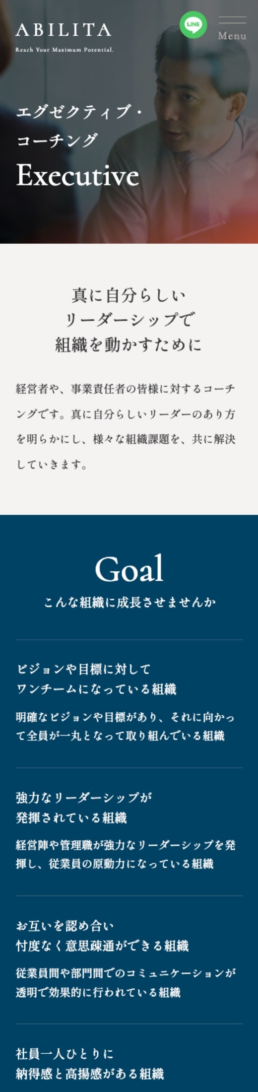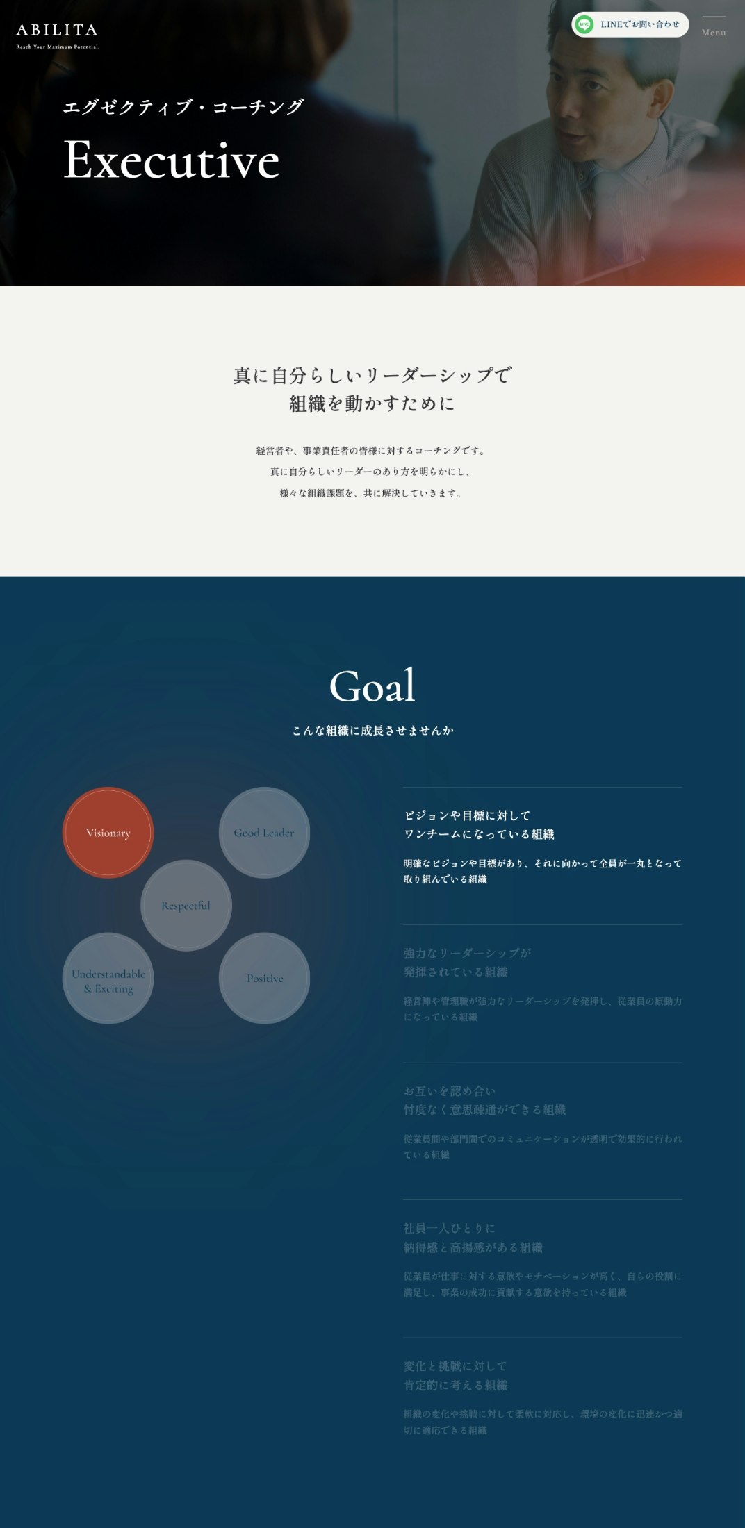 経営者やリーダー層向けにコーチング・研修事業を展開する、アビリタ株式会社さまのコーポレートサイトを制作いたしました。企画設計とコピーライティングを株式会社ピストルズさまが、デザインとコーディングを弊社が担当させていただきました。