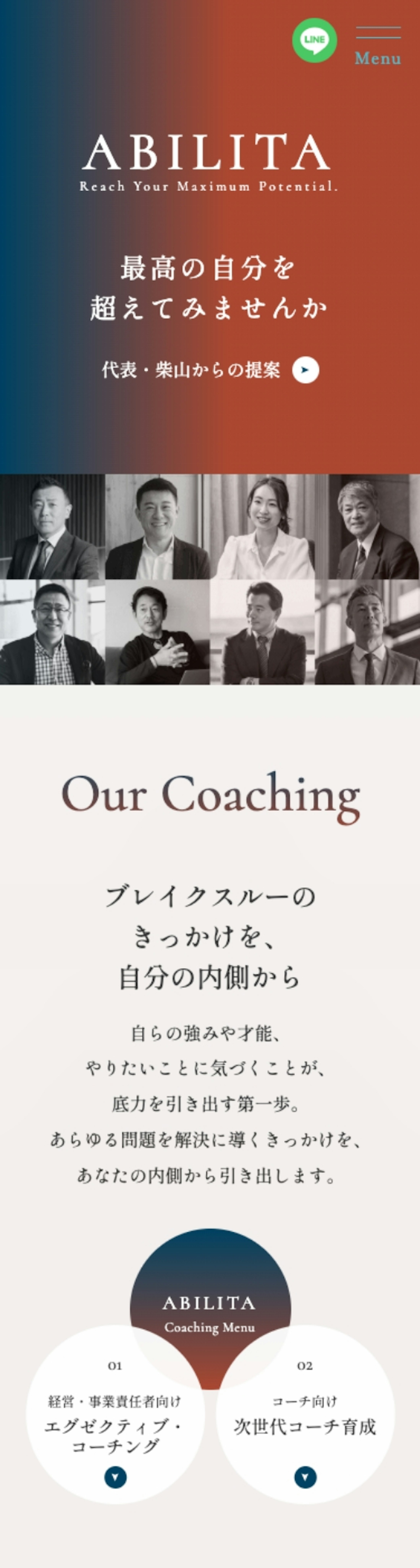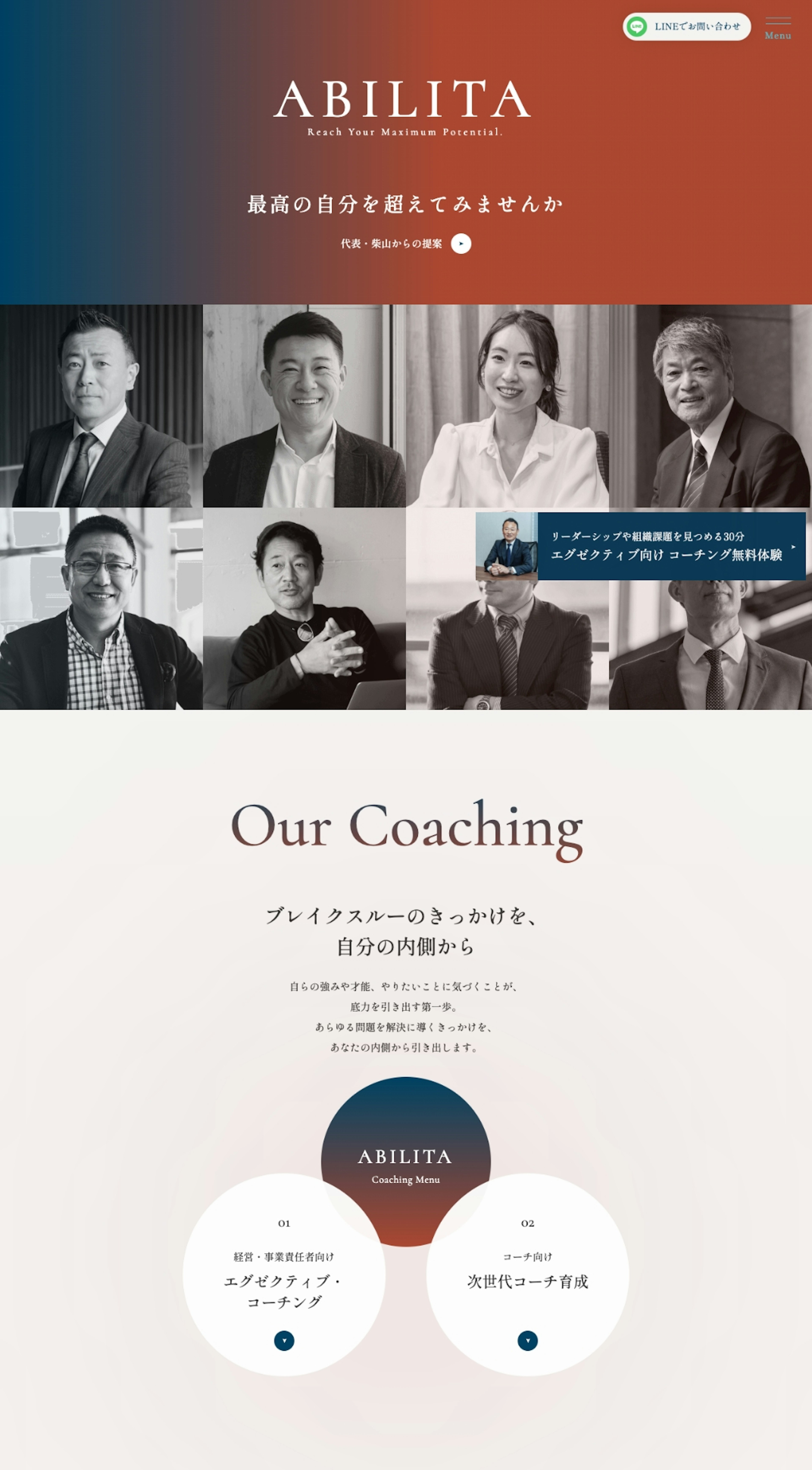 経営者やリーダー層向けにコーチング・研修事業を展開する、アビリタ株式会社さまのコーポレートサイトを制作いたしました。企画設計とコピーライティングを株式会社ピストルズさまが、デザインとコーディングを弊社が担当させていただきました。